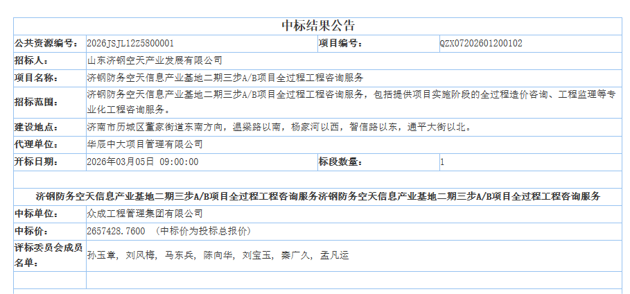 济钢防务空天信息产业基地二期三步A/B项目全过程工程咨询服务中标结果公告