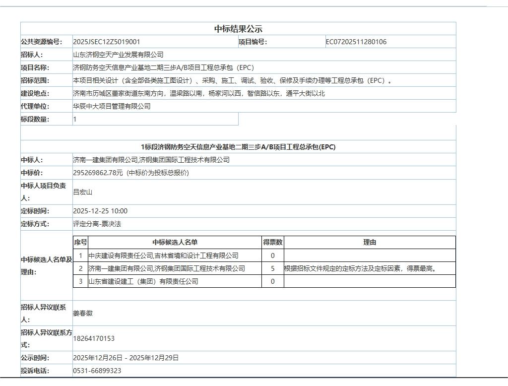 济钢防务空天信息产业基地二期三步A/B项目工程总承包(EPC) 中标结果公告