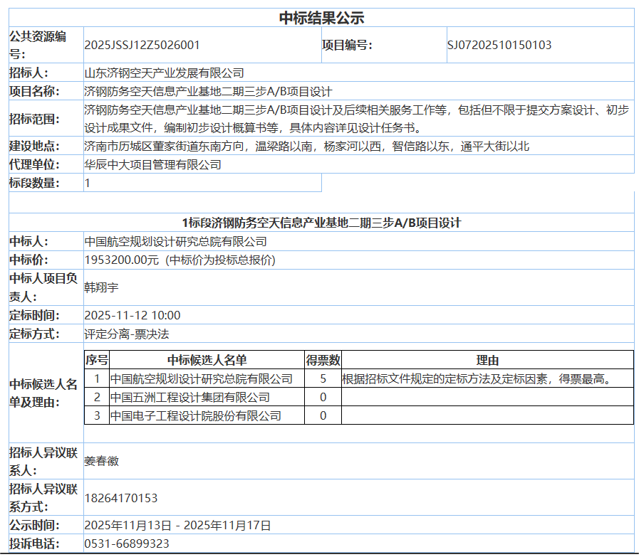 济钢防务空天信息产业基地二期三步A/B项目设计中标候选人公示